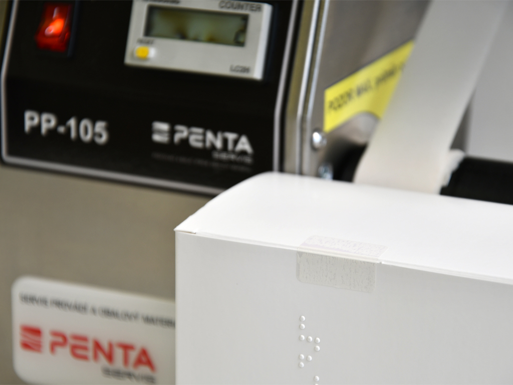 Balení léčiv – aplikace etiket přes okraj obalu