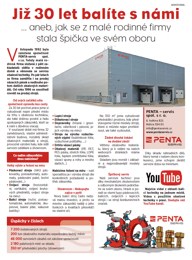 1. 12. 2022V pátek 11. 11. 2022 jste si mohli ve speciální příloze MF Dnes „Mistři oborů“ přečíst pár řádků k 30. výročí založení společnosti PENTA-servis. Článek pojednává o její cestě od samotného založení až do současnosti.