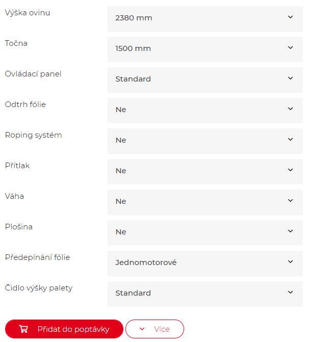 Nabízíme jednoduché řešení. Sestavte si ovíjecí stroj sami a bude přesně takový, jaký potřebujete! Sami si zvolte velikost otočné plošiny, výšku ovíjení, typ ovládacího panelu a vybavte ovíječku dalším příslušenstvím, které požadujete (přítlak, čidlo pro černé předměty, dotykový panel, váha, odtrh fólie, roping systém, předepínání fólie, nájezdová plošina atd)
