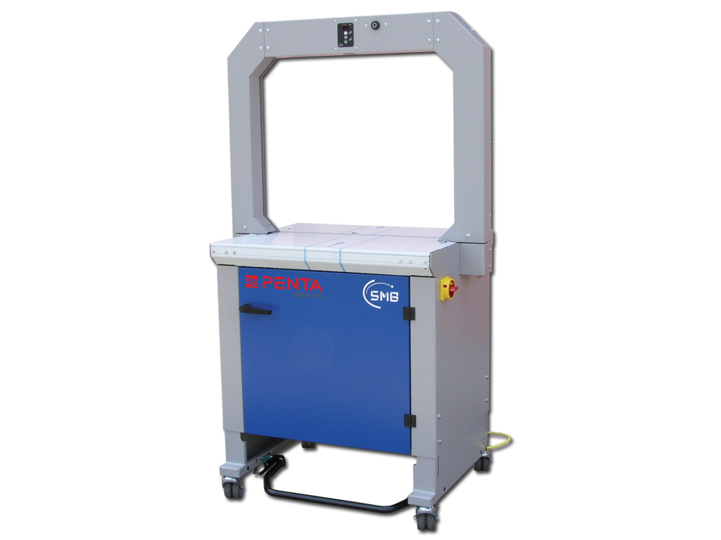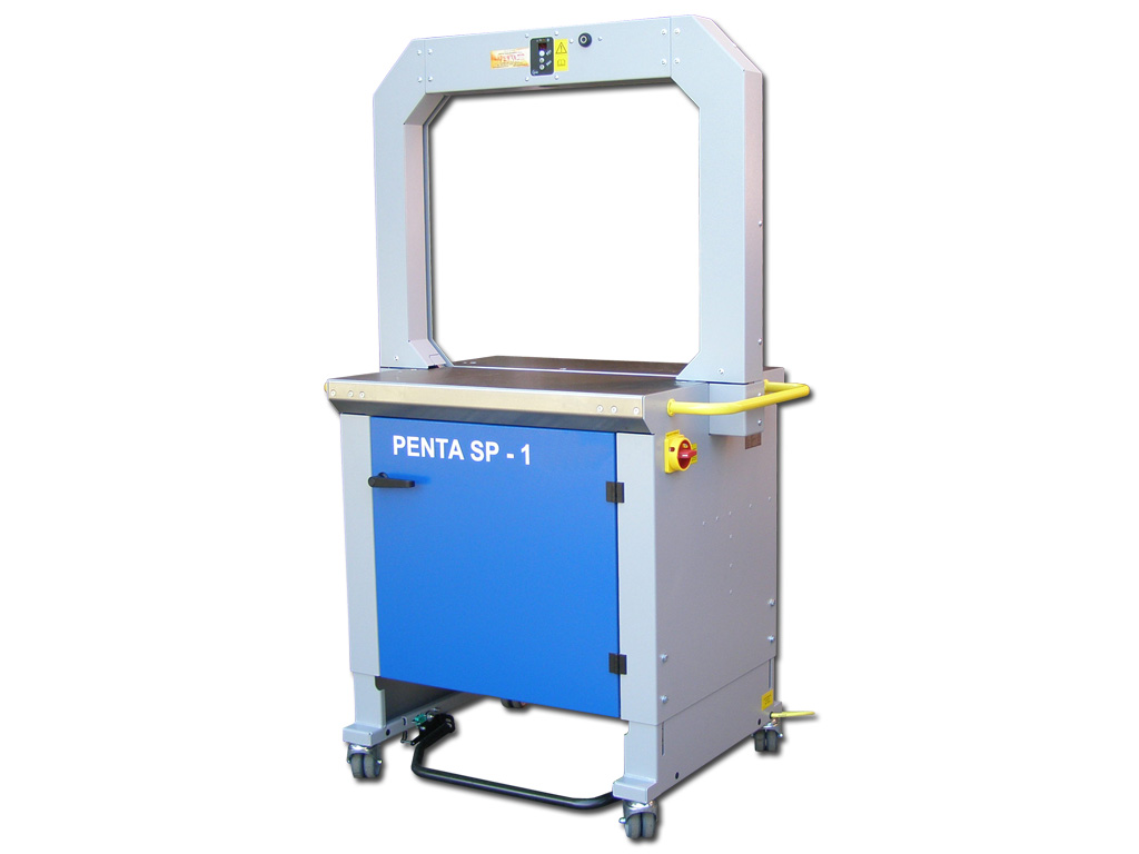 Automatický páskovací stroj PENTA SP1 je zejména určený k páskování novin, časopisů, obálek a dalších tiskovin, lze jej však použít na kartony i jiné předměty. Na stroji se používá PP pásek šíře 5-9 mm (možno upravit na šíři 12 mm za příplatek). Při výměně cívky se PP pásek zavádí automaticky, po vsunutí pásku do štěrbiny ve stroji, což zajišťuje minimální prostoje. Utahovací síla je plynule nastavitelná, případně řízena automaticky pomocí ultrazvukového senzoru. Četnost páskování je až 52 cyklů za minutu, závisí na velikosti obvaděče. Tento výkon řadí stroj do vyšší třídy páskovacích strojů. Páskovací stroj PENTA SP1 nabízí dvě varianty ovládacího panelu. V první řadě se jedná o totožný panel jako u páskovače PENTA SP1 NEW, kde je možné v základním režimu nastavit pouze utahovací sílu. V pokročilém režimu je samozřejmě možné detailní nastavení, jako např. čas nástřelu, položení pásku, teplota svařování, aktivace stolního čidla atd., v horní části obvaděče. Druhá varianta ovládacího panelu vhodná spíše pro pokročilé uživatele, nabízí možnost programovat ultrazvukové čidlo (napínací křivku) atd. Výška stroje je plynule nastavitelná v rozmezí 796 – 909 mm.