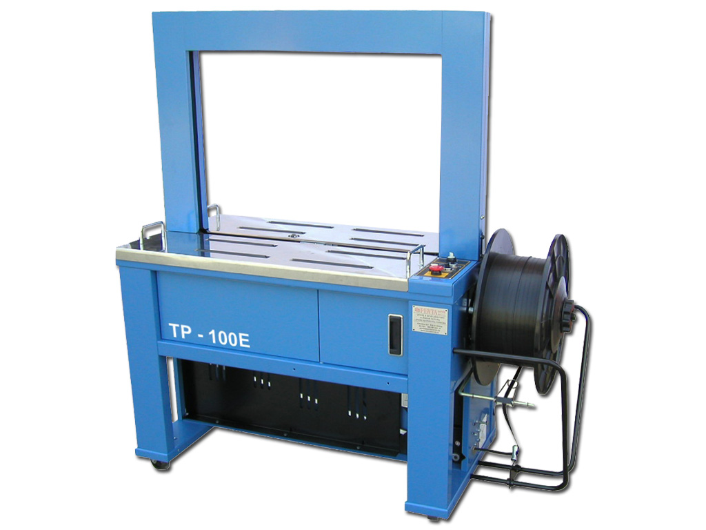 Automatický páskovací stroj TP-100E, určený do méně náročných provozů, slouží k páskování předmětů PP páskem šíře 12 mm. Spoj tvoří tepelný svár. Stroj TP-100E je ekonomickou variantou známého stroje TP-101. Klapková konstrukce obvaděče má pevné rozměry 850 x 600 mm (š x v). Řízení mechaniky stroje je řešeno bezdotykovými snímači polohy a řídící deskou. Přednostmi stroje jsou jednoduchá konstrukce, dlouhá životnost a výhodný poměr ceny ke kvalitě. Stroj disponuje otočnými kolečky pro snadnější manipulaci.
