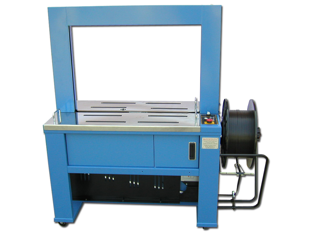 Automatický páskovací stroj TP-100E na PP pásek šíře 12 mm, vhodný do provozů, kde četnost páskování nepřesáhne 24 úvazků/min. Plynulá regulace utahovací síly do do 700 N. Minimální rozměr páskovaného předmětu je 100 x 30 mm, maximální 750 x 500 mm (š x v). Rám je klapkové konstrukce s pevným rozměrem 850 x 600 mm (š x v).