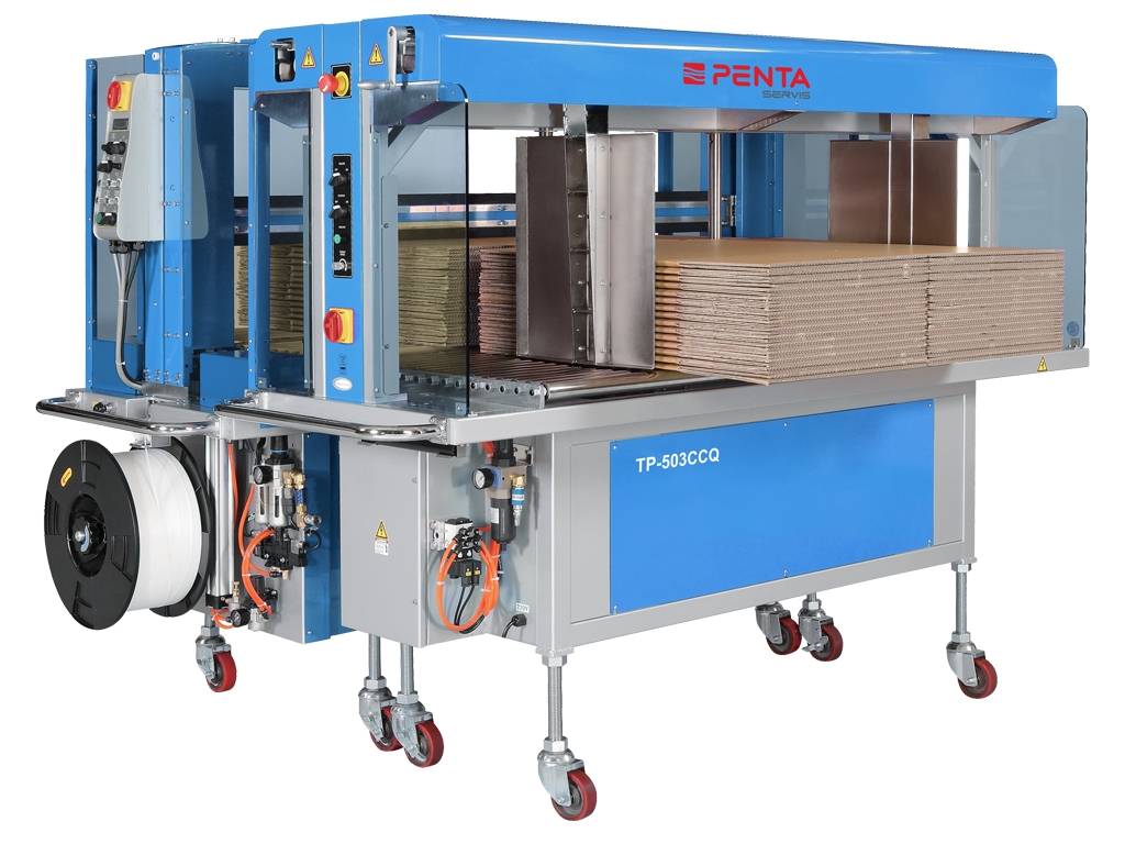 Automatický páskovací stroj TP-503CCQ je určený pro páskování kartonů a vlnité lepenky. Stroj pracuje s polypropylenovým PP páskem šíře 5 – 6 mm nebo 9 mm. Pneumatický přítlak je umístěn po celé délce stroje a zajistí tak rovnoměrné stlačení páskovaného kartonu. TP-503CQ je složen z páskovacího stroje TP-503C a rovnacího stroje CC-BBS s 3 stranným rovnáním.