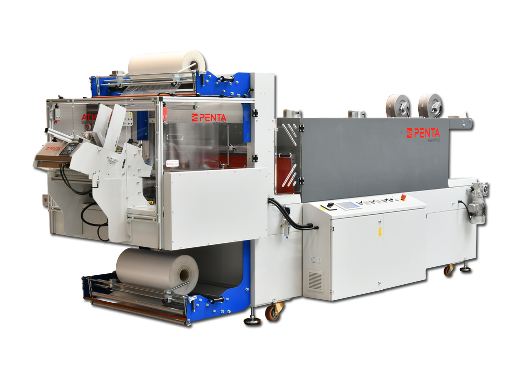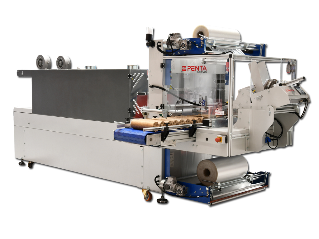 Skupinový balicí stroj PE-850CR s bočním dopravníkem a zakladačem etiket je vyroben na zakázku a dosahuje výkonu 6 – 10 skupin/min.