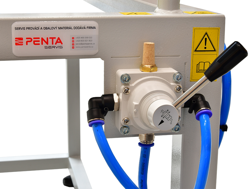 Ovládání dopravníku je snadné, pomocí páky dochází k plynulému přetočení dopravníku z výchozí polohy do polohy pracovní. která je opatřena válečky pro snadnou následnou manipulaci s baleným produktem.